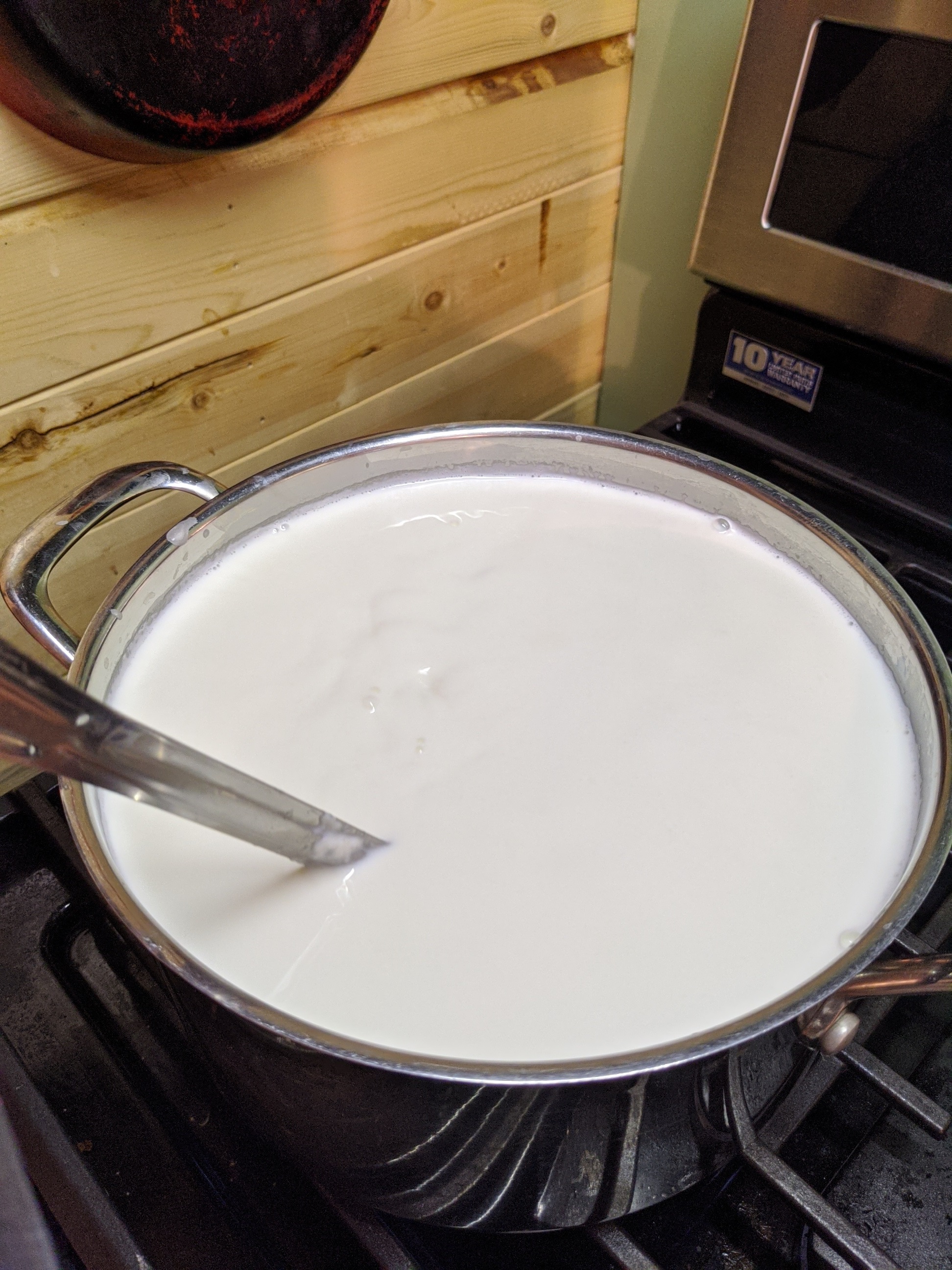 - Pour the gallon of raw milk into large kettle and heat to 170- 180 F .