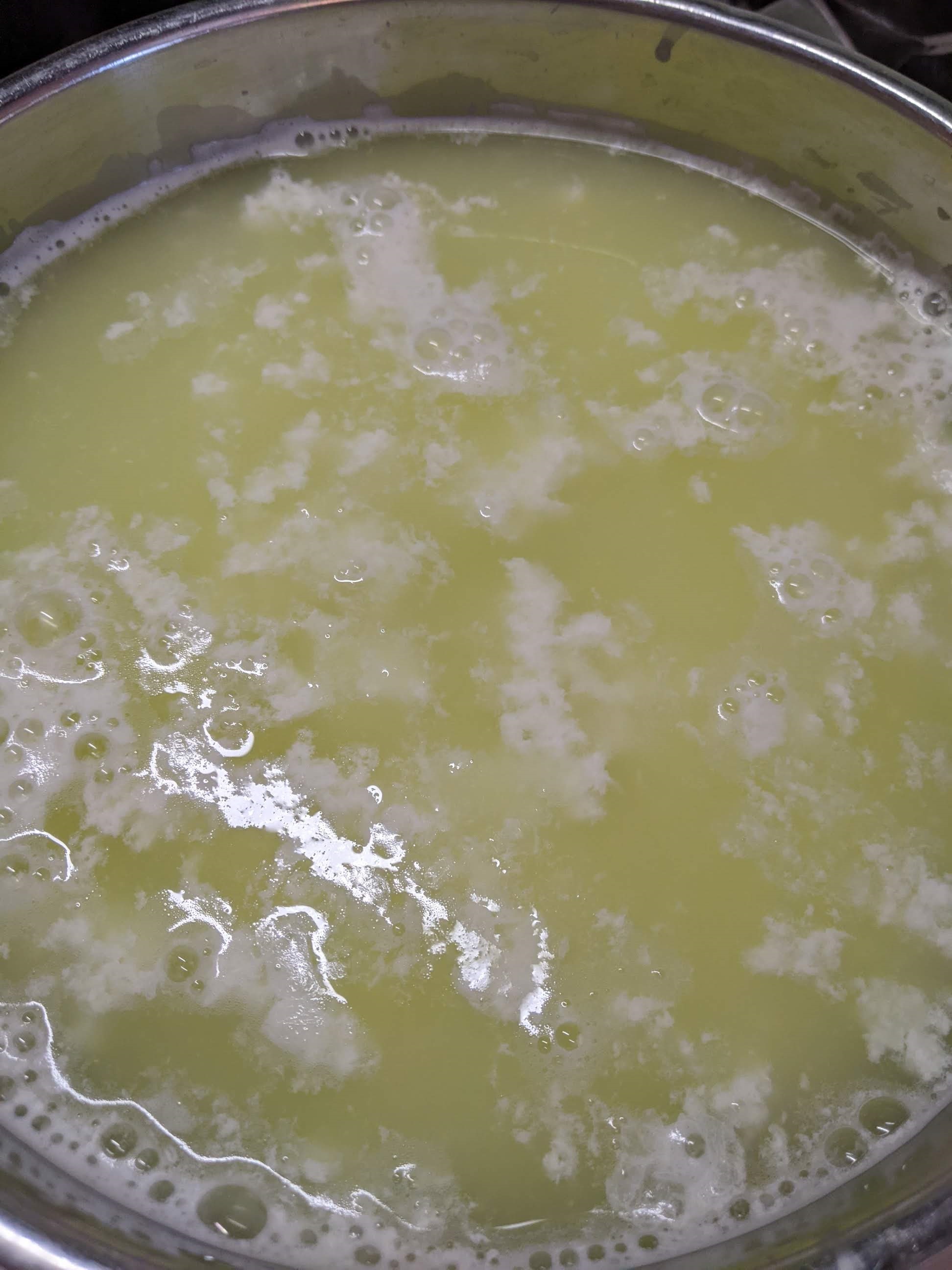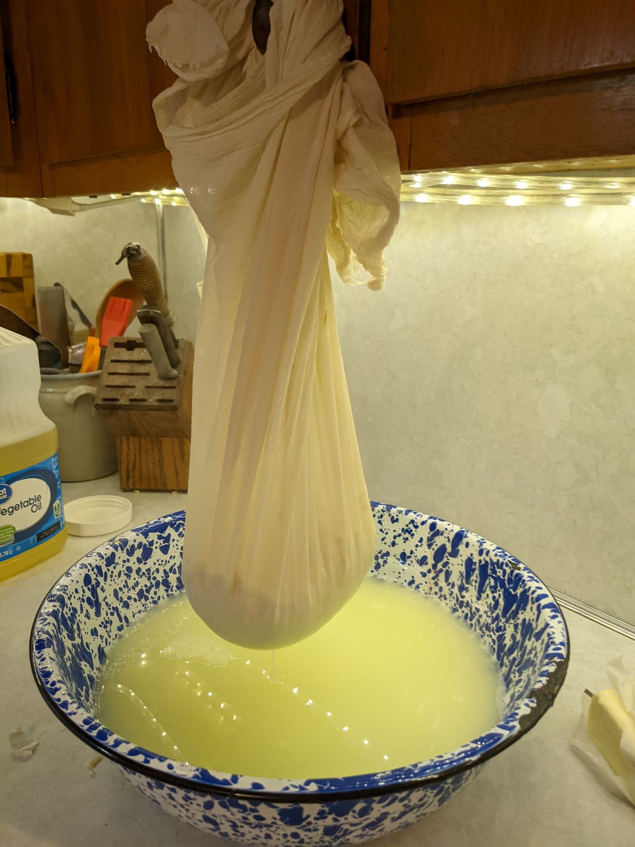 - Pour the curds and whey into the cloth in the colander. You will want to find a way to hang it up in order for the whey to drain off. I often let it drip for a couple hours, but you can save some time by twisting the cloth and gently squeezing the whey out of the curd.
