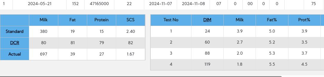 | Year & Lac.# | DIM | Butterfat | Protien | Total lbs |