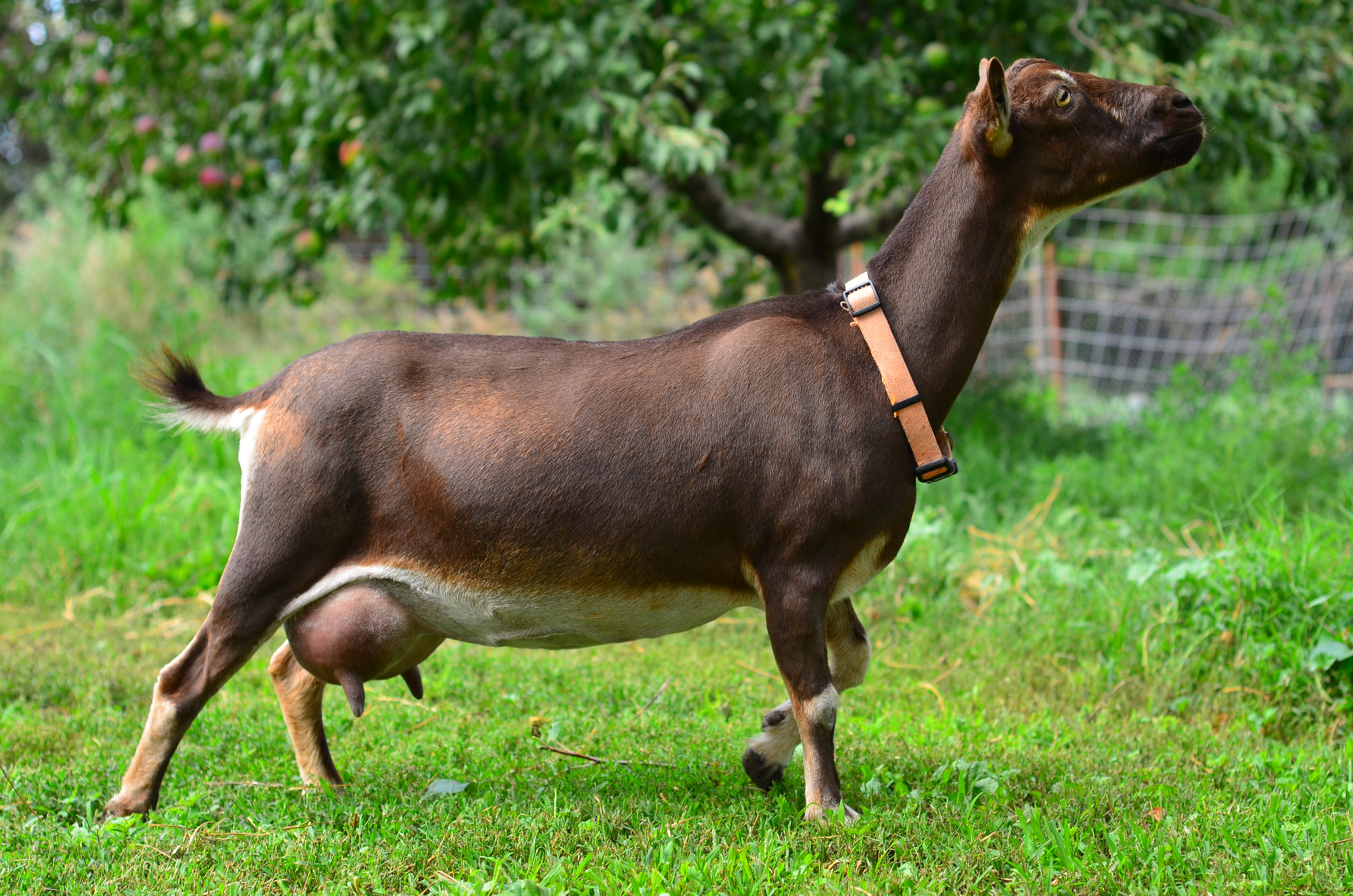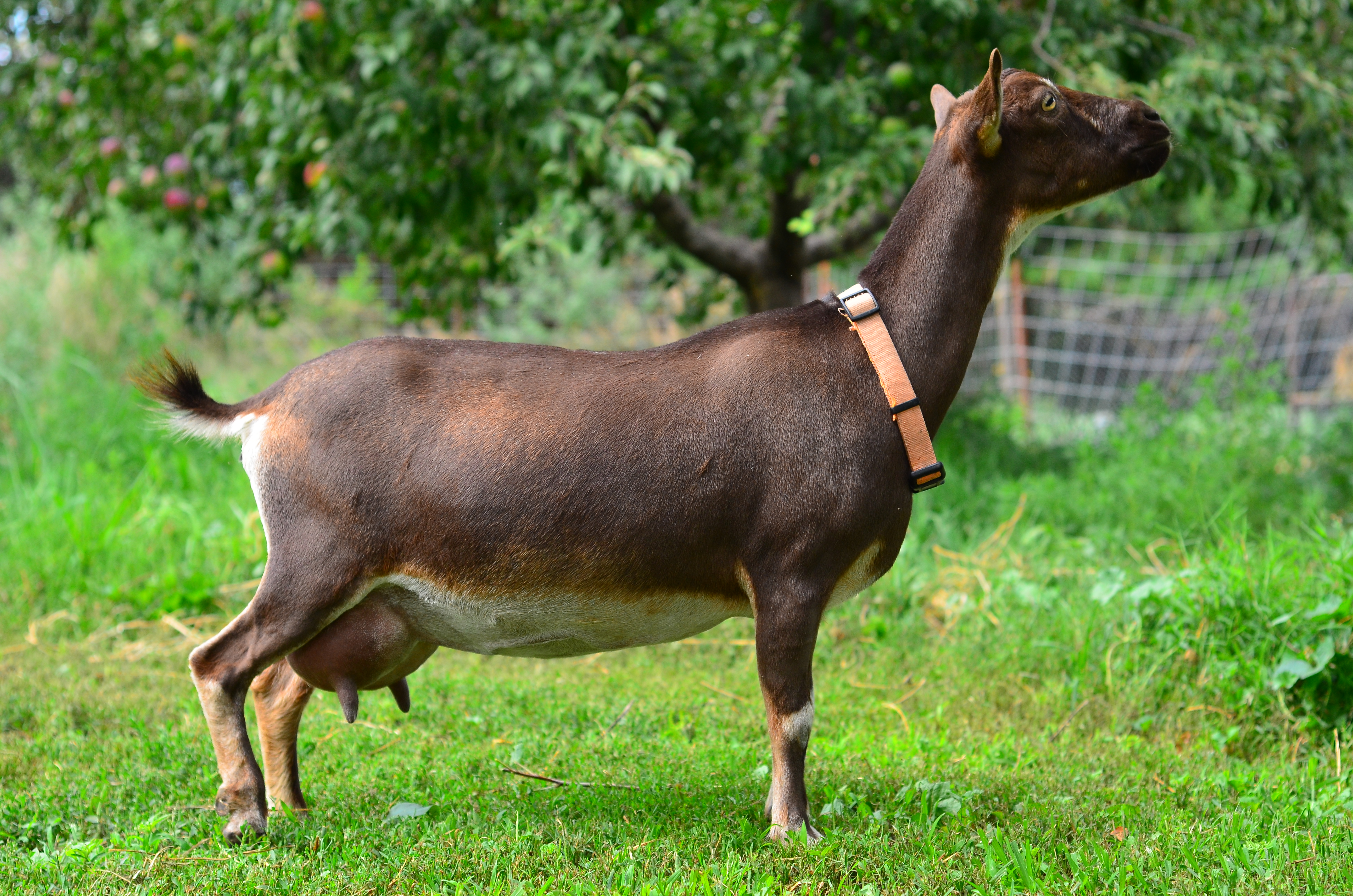 This doe is the result of our work with our “Butterscotch” line. Sired by “Old Beach ZZ ZYD Yorktown”, she is a strong milk producer, peaking at 6.6 pounds on her third lactation! Ginnette crashed after her high peak in 2025. Thankfully she pulled through, staying steady at 3 lbs for several months.
